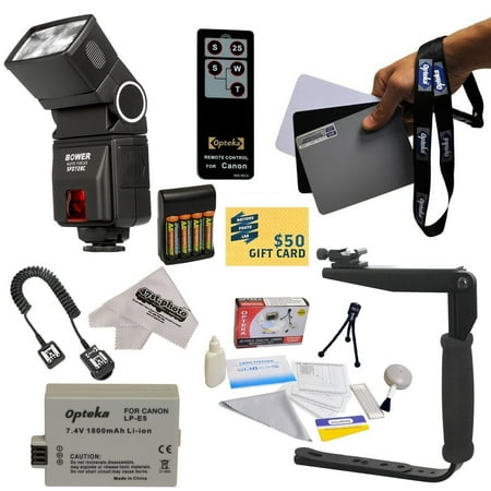 Related Product Bower SFD728 Autofocus TTL Flash Kit for Canon EOS 450D 500D 1000D T1i Xsi DSLR with Grey Card Set + Flash Bracket + LP-E5 1800MAH + Charger + AA Batteries & Charger + Wireless Remote + $50 Gift Card
